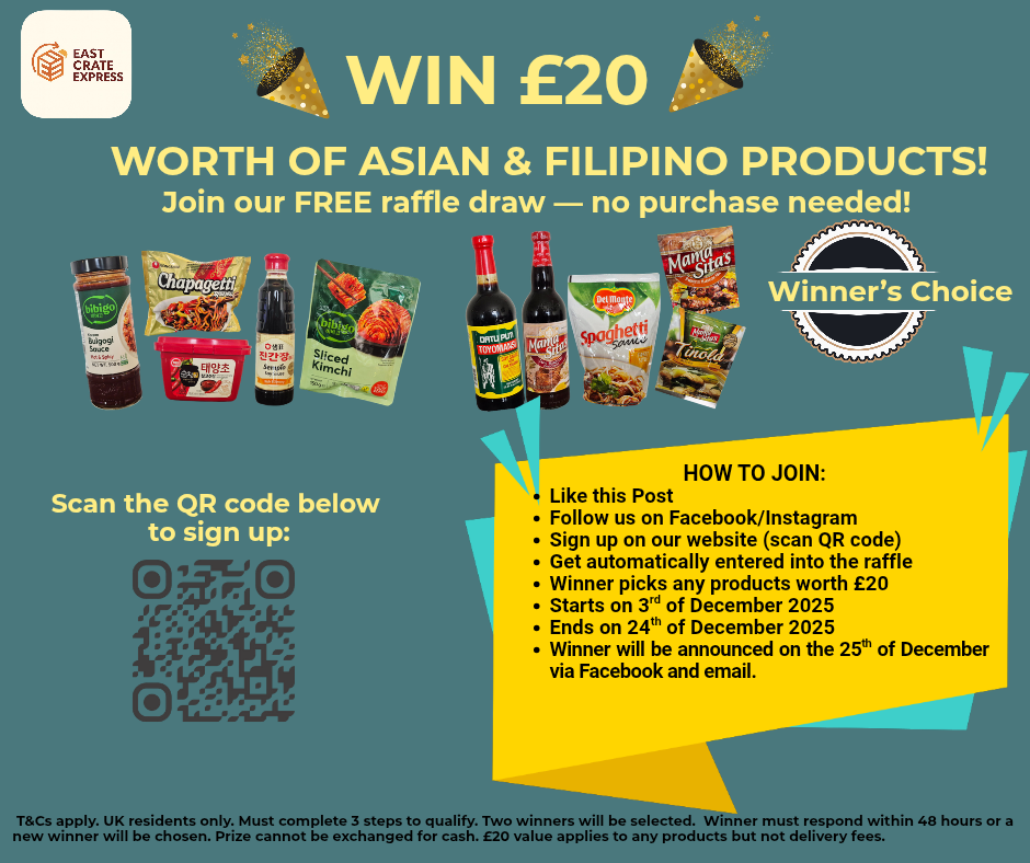 Feeling lucky? You might just win £20 worth of your fave Asian & Pinoy goodies! No purchase, no stress — just join our FREE Christmas raffle!